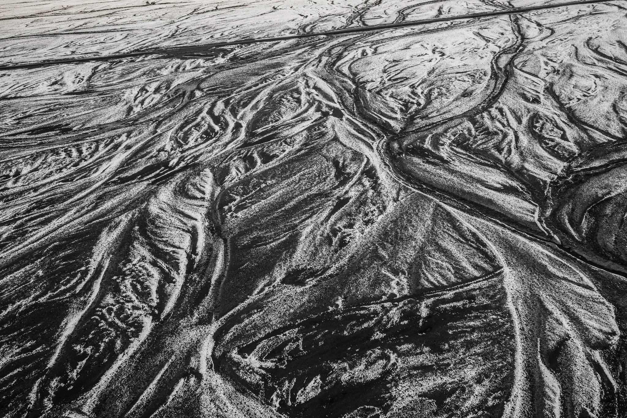 DRONESCAPES and AERIALS, especially when the horizon is not included, straddle both landscapes and abstractions. They are, in effect, concrete abstractions, serving both a documentary and an aesthetic purpose. The great aerial photographers, like William Garnett, Arthus-Bertrand, Edward Burtynsky, Tom Hagen, and contemporary Icelandic photographers deserving of wider recognition, Sigurgeir Sigurjohnsson and Ragnar Axelsson, all possess an acute sense of composition. Occasionally their work includes figuration, which they typically do not officially acknowledge. FUN FACT: early abstract painting (around 1910) was inspired by aerial photography from hot-air balloons and tends to be geometric—like agriculture seen from the air today.
